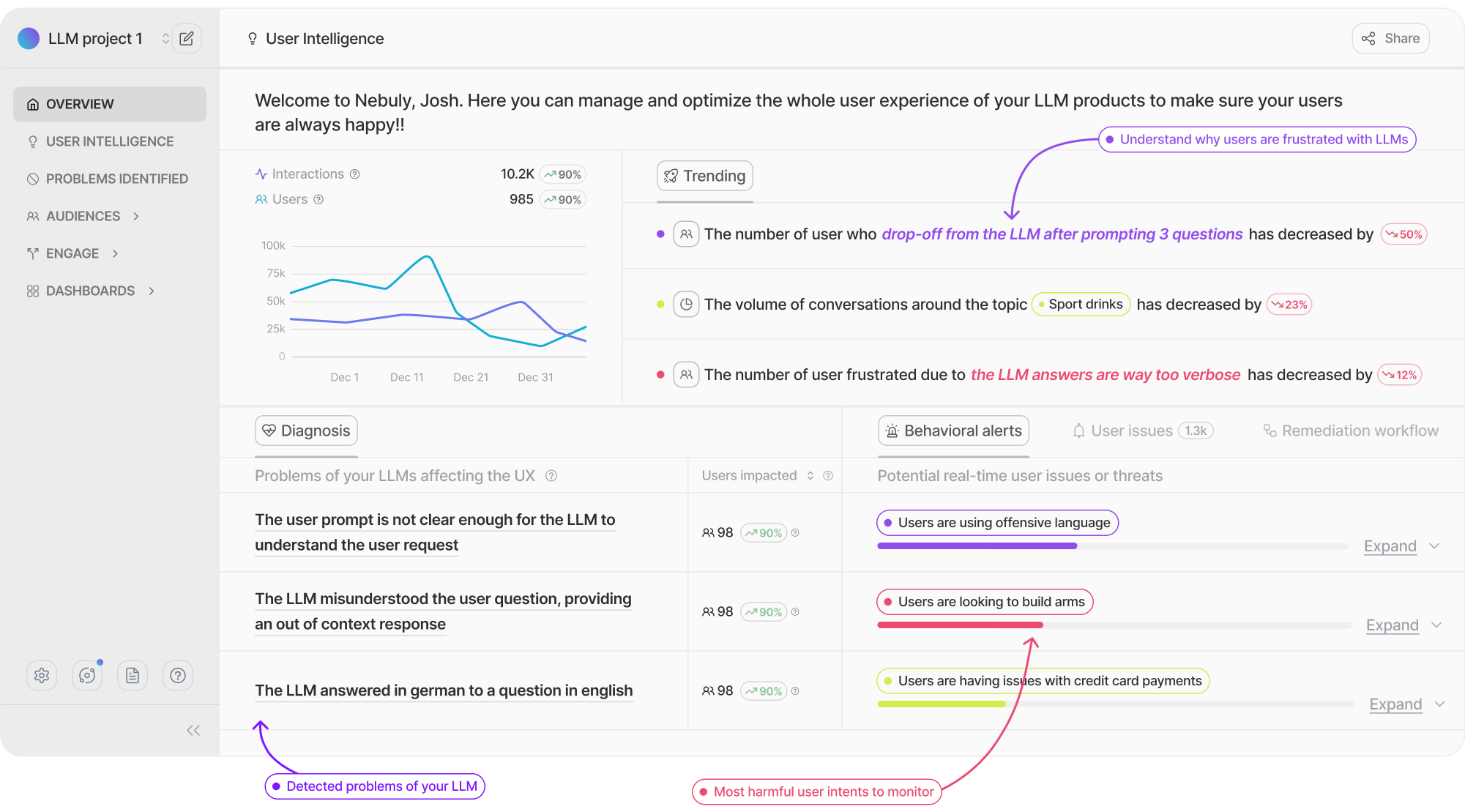 Nebuly not only provides visual dashboard for analyzing trends but the insights and tools needed improve your chatbot's effectiveness and ROI.