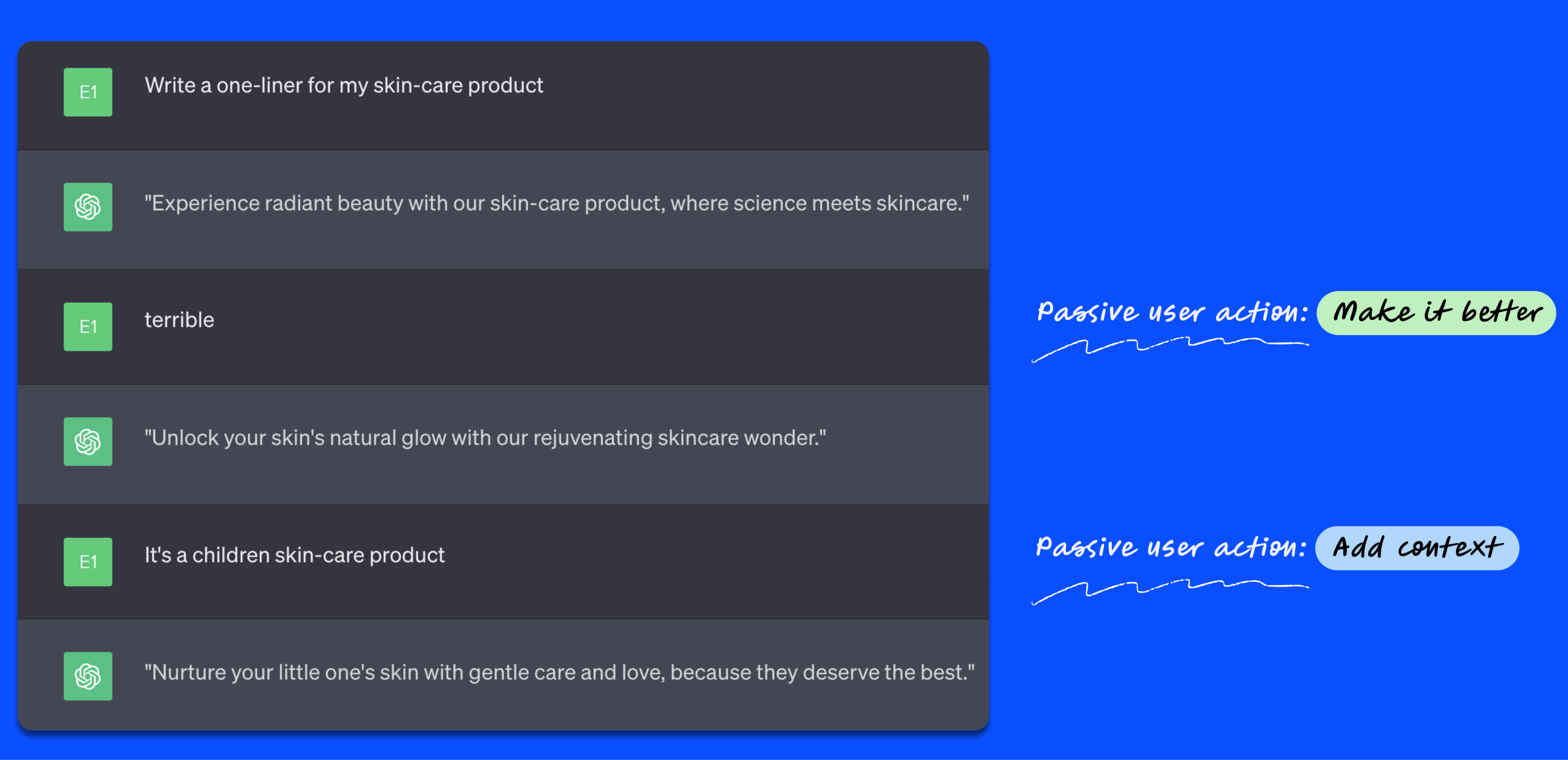 - Passive User Actions (PUA): Passive User Actions encompass the subtle, implicit behaviors users exhibit without directly instructing the LLM. Examples include copying the LLM's previous response and pasting it into a new prompt or subtly adding context to a query before posing it. These actions give clues about user intentions or needs without explicit commands.