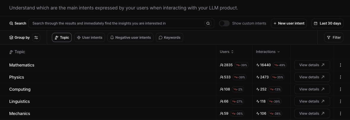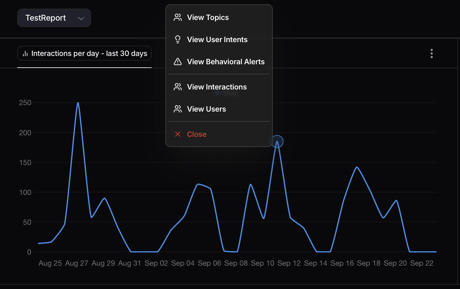 You can now click directly on points of interest (e.g., spikes) within your report charts to view the associated interactions, user intents, or topics. This feature allows for a more detailed and intuitive exploration of data trends.