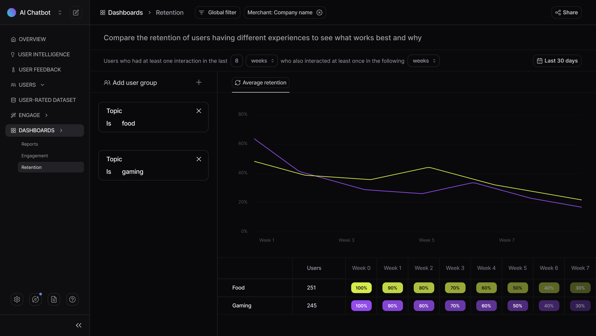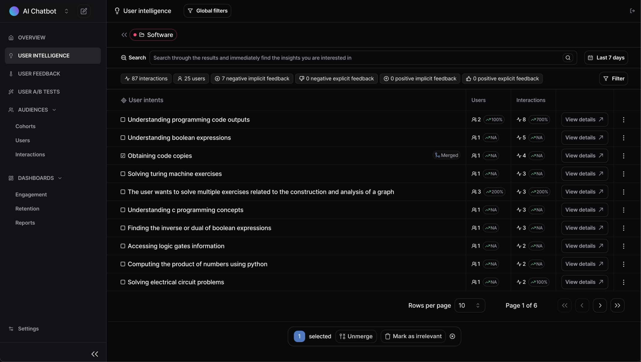 To provide a comprehensive analysis of how your users are interacting with the chatbot, we have added two more metrics you can monitor to the user intelligence page:
