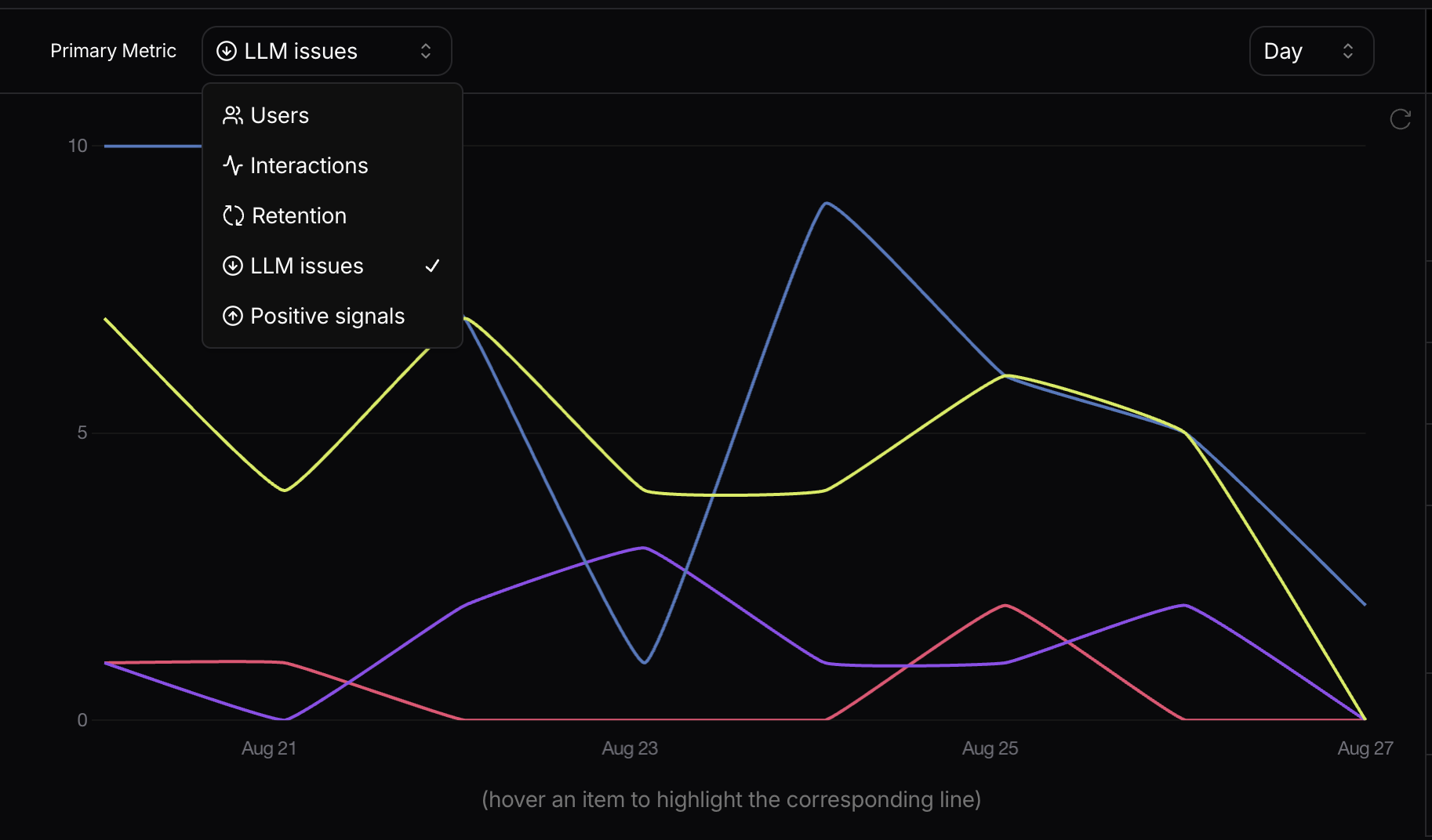 For each user metric (such as a specific topic), you can choose to visualize the trend of various related “primary metrics.” For example, you might explore: