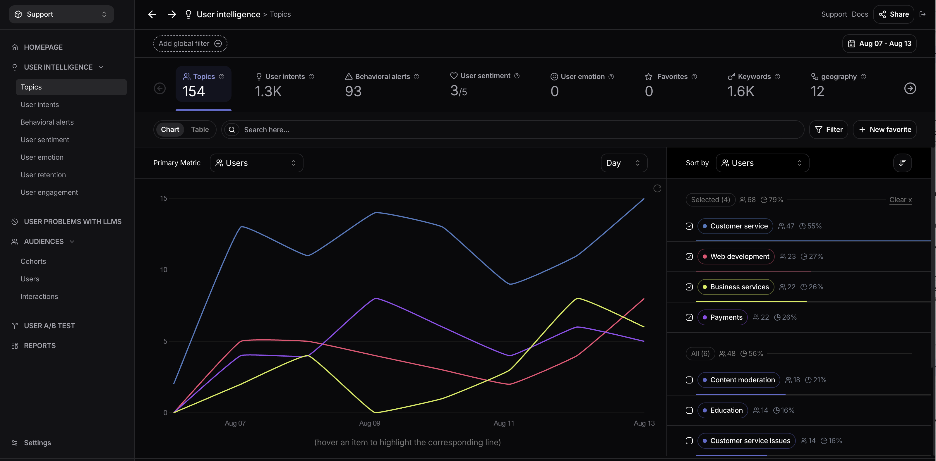 Where you can select the topics, intents or behavioural alerts you are most interested in and visualize them as a time-series in the selected time range. This will help you in analysing the trends in the time-frames you are most interested in.