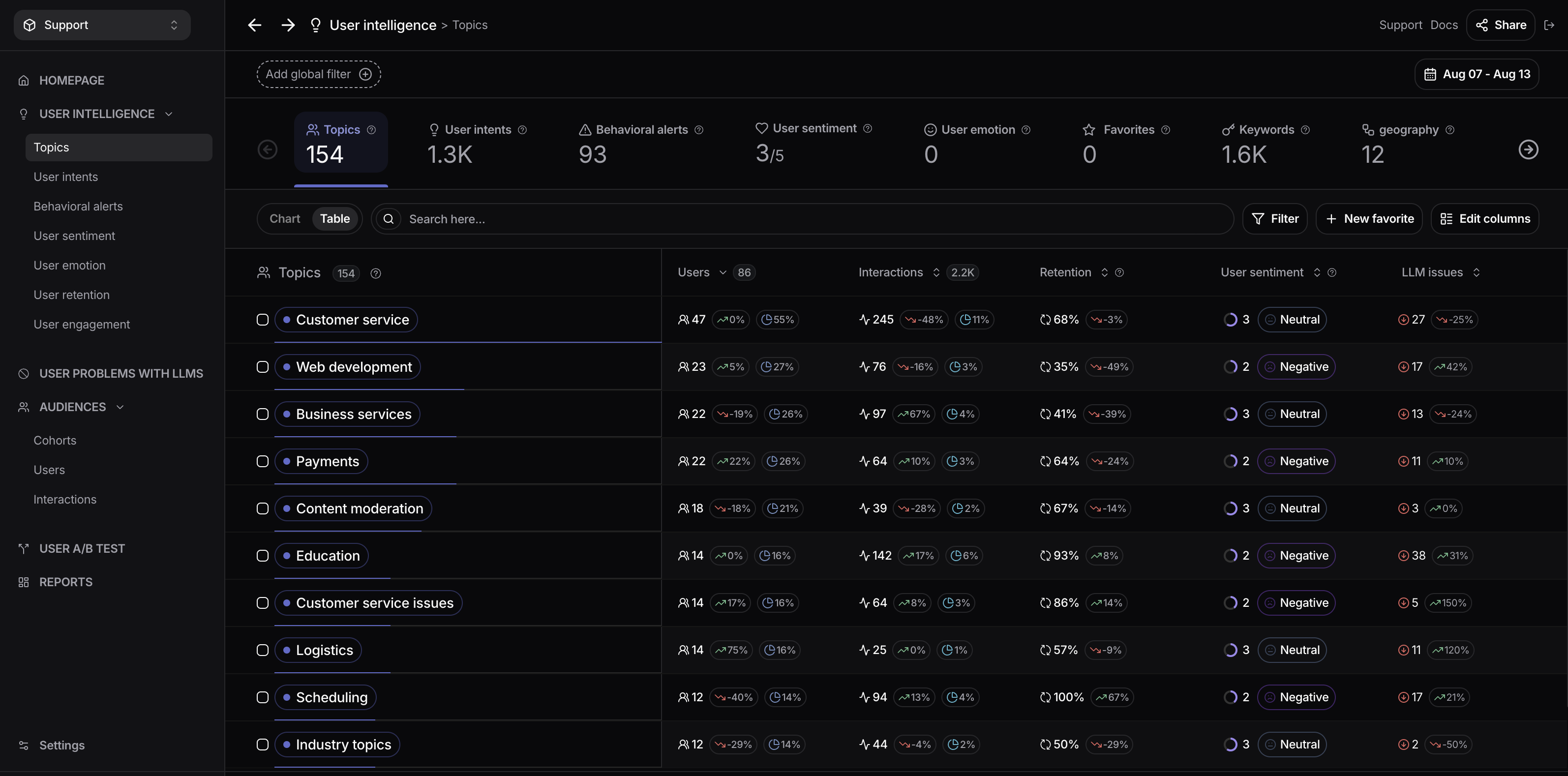 Both metrics are computed at the interaction level and can be visualized on the User Intelligence page as well as in reports.